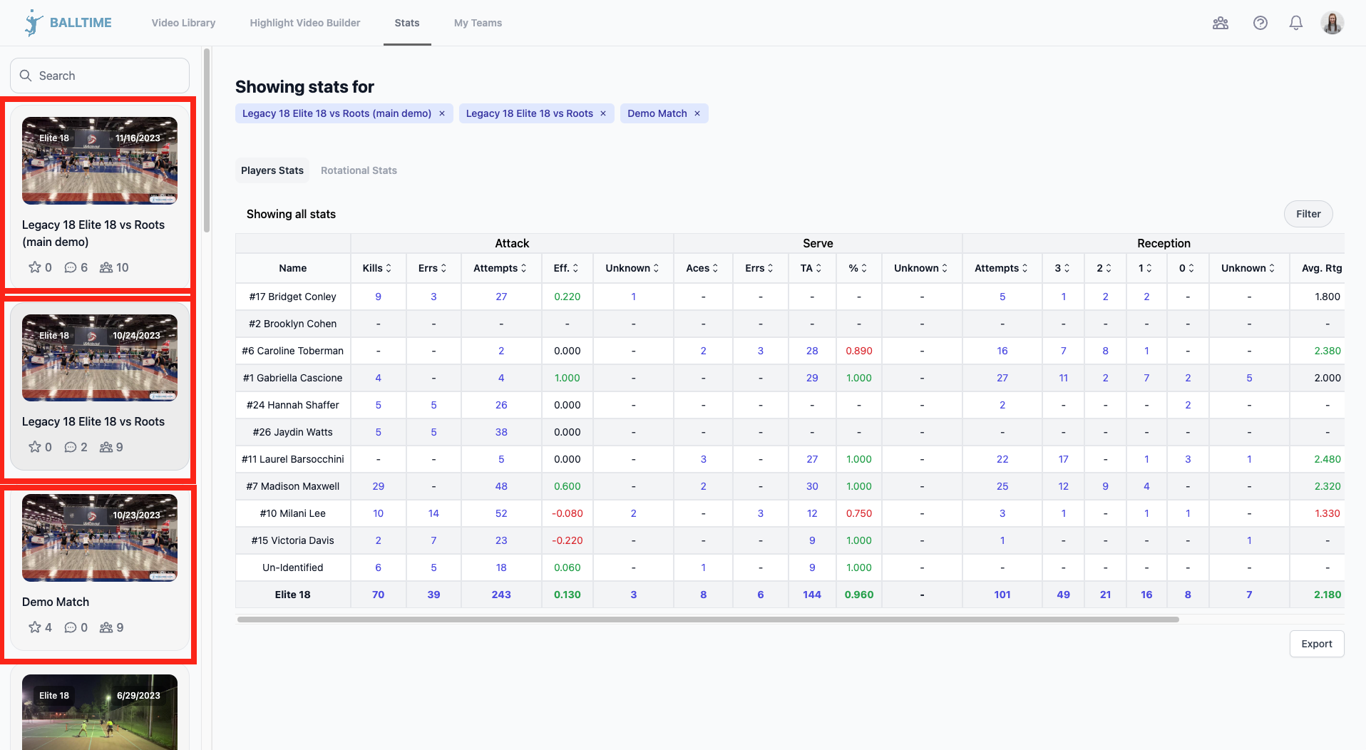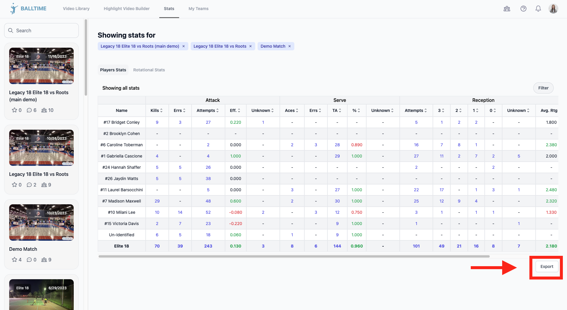 Select Export. The stats will export as a csv file.